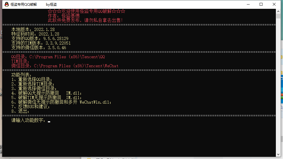 怪盗QQ专用PJ-全新开发,自从上个版本以后,电脑就坏了好久,都没时间更新,现在作者 @怪盗 才有空去网吧更新,发帖也是在手机发的;重新写过代码,利用特征码定位,跨版本应该没问题,但是还是要保证支持最新版,旧版可能就会出现破解成功,但是登录后就会出现错误的情况;尽量都使用新版本吧,特别是微信,更新好像特别频繁,都是在刷版本号;去掉了上个版本的勋章墙,QQ和tim防撤回是没有提示,微信的是有;但是也是不会对应撤回的那条消息,凑合用吧!