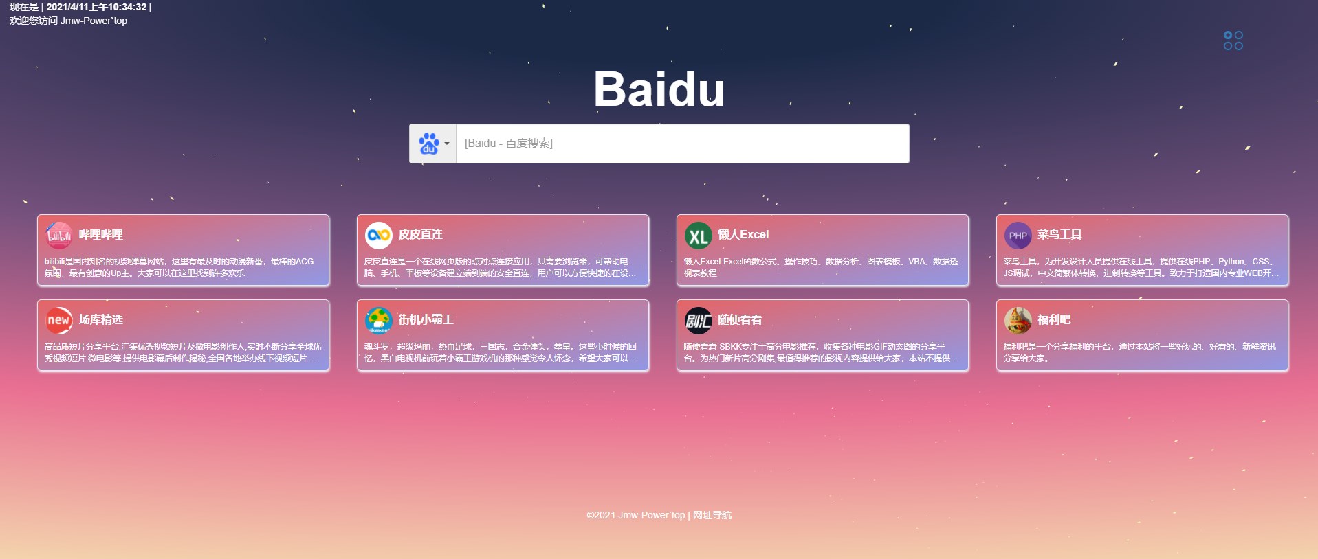 Jmw-Power`top|网址导航-为您提供更方便简洁的网址导航服务,提供网链的本地模糊搜索服务,你想要找寻的,一搜即有。特色: 输入框输入你想要找寻的站点关键字本地即会输出显示相关站点信息,回车使用搜索引擎搜索,简洁而不简单。