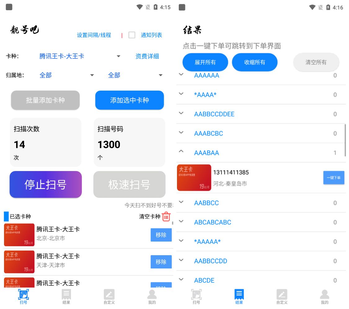 靓号吧是一款可以扫描腾讯大王卡,阿里大宝卡,米粉,歪卡等的扫号软件;该软件可扫描十多种卡号,使用户可以轻松获取自己喜欢的卡号;软件全部功能已做了去会员限制处理!自动扫描运营商号池号码,筛选分类,便于查找自己心仪的号码,全部免费一键下单!
